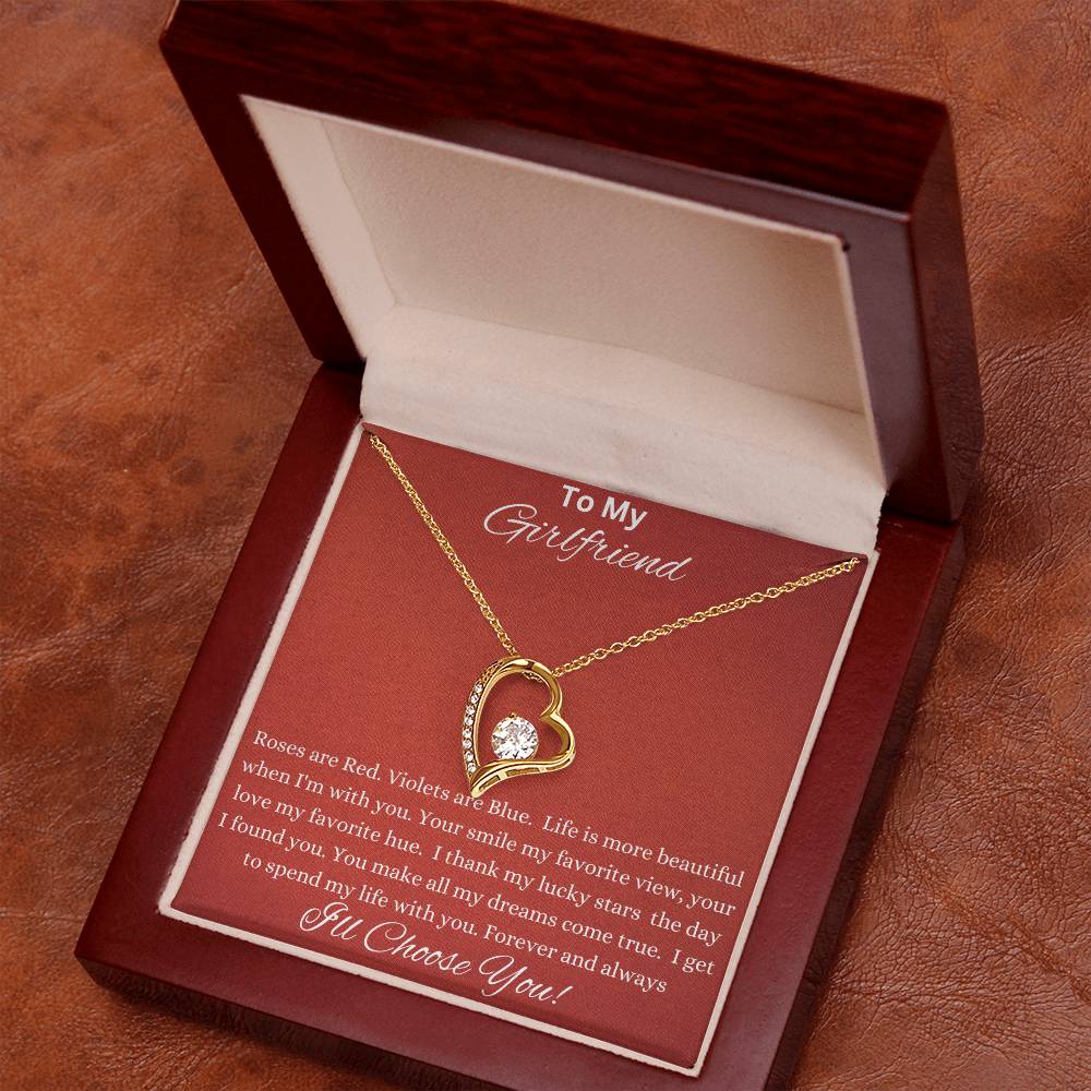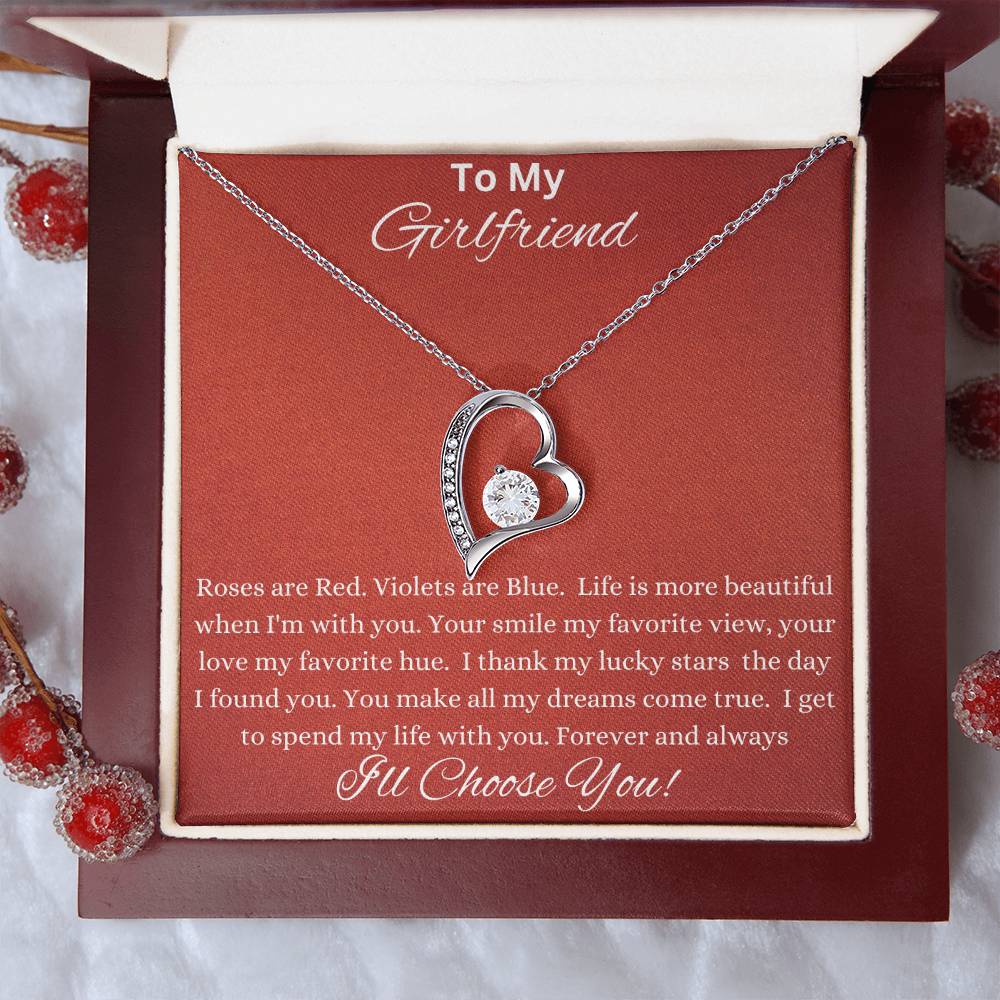 To My Girlfriend: Roses are Red. Violets are Blue. Life is more beautiful when I'm with you. Your smile my favorite view, you love my favorite hue. I thank my lucky starts the day I found you. You make all my dreams come true. I get to spend my life with you. Forever and always I'll Choose You!