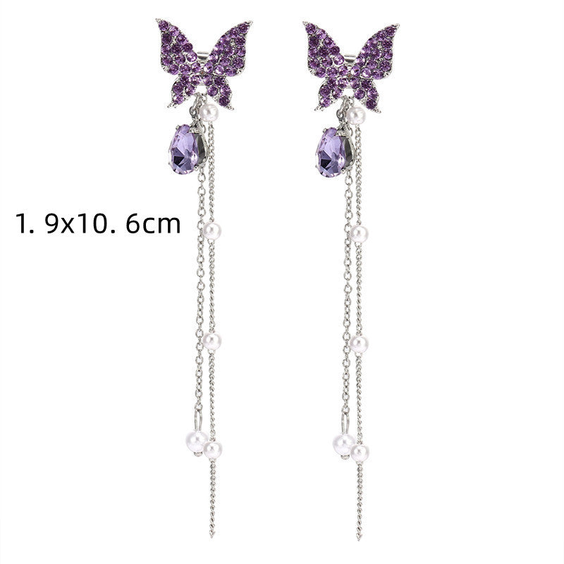 Colores principales: cristal azul con aguja plateada, estrella de cinco puntas con cristal blanco con aguja plateada, alambre para oreja E0072, diamante púrpura, diamante colorido, borla plateada con forma de mariposa y aguja, color de borde dorado negro