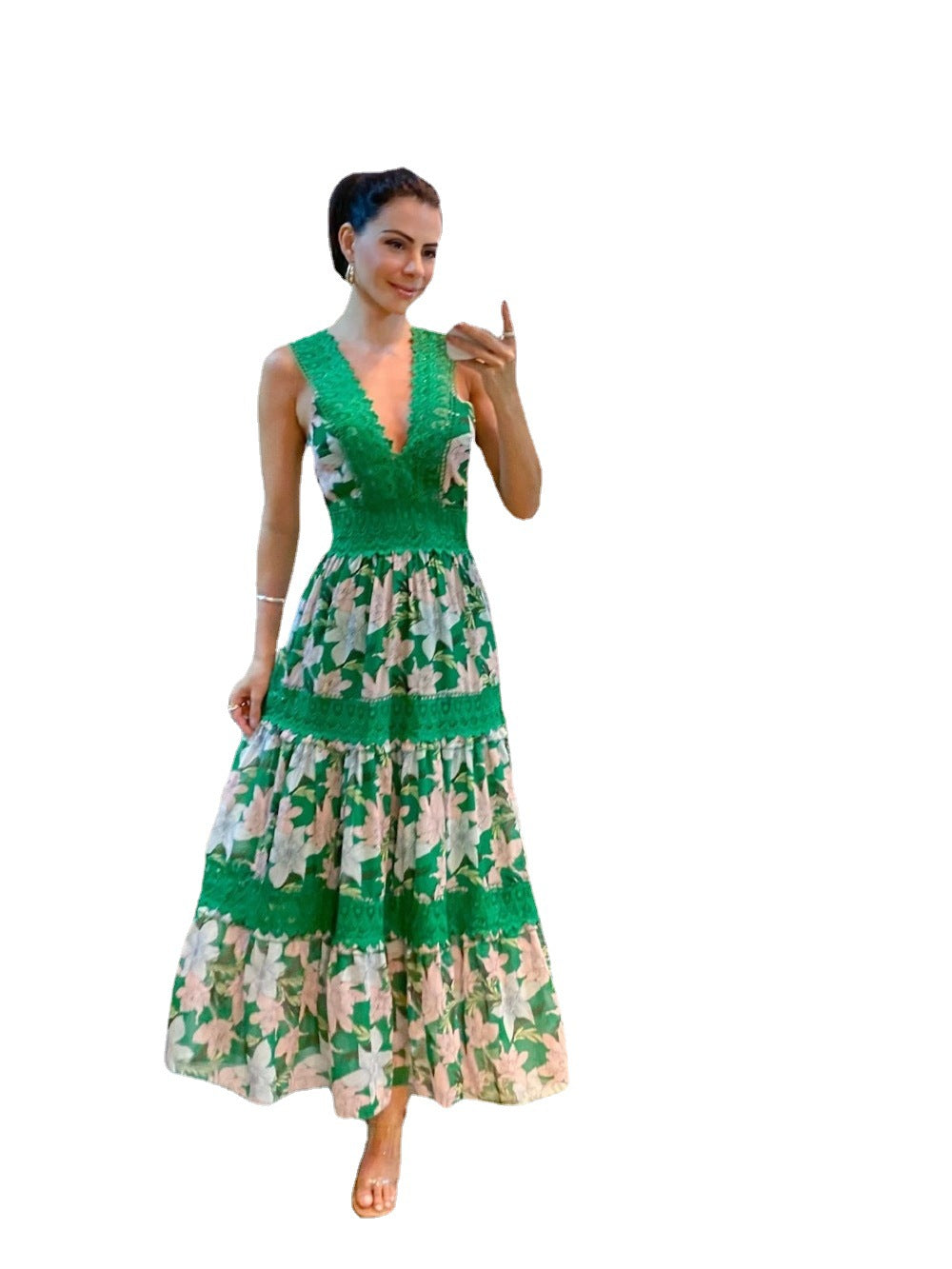 Vestido largo sin mangas con cuello en V y encaje para mujer