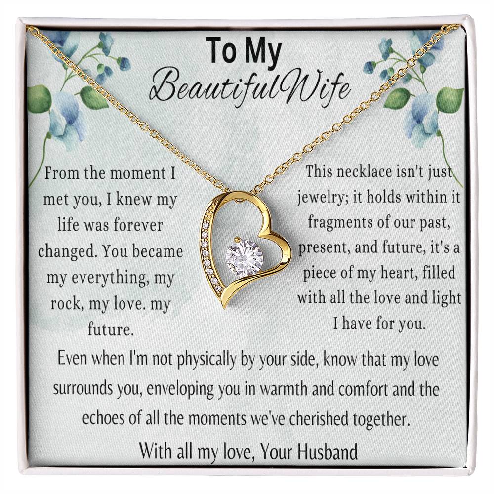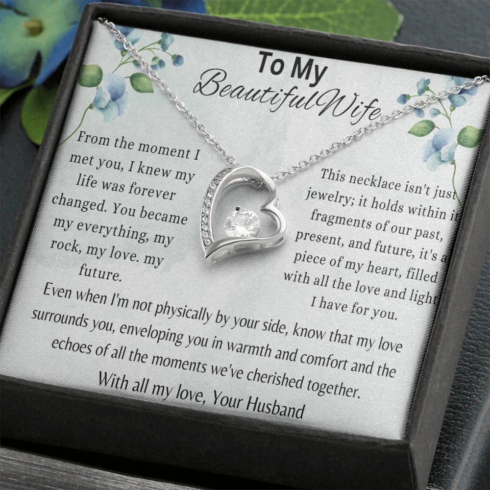 From the moment I met you, I knew my life was forever changed. You became my everything, my rock, my love, my future. This necklace isn't just jewelry, it holds within it the fragments of our past, present, and future. it is a piece of my heart, filled with all the love and light I have for you even when I'm not physically by your side, know that my love surrounds you, enveloping you in warmth and comfort and the echoes of all the moments we've cherished together. With all my love, Your Husband