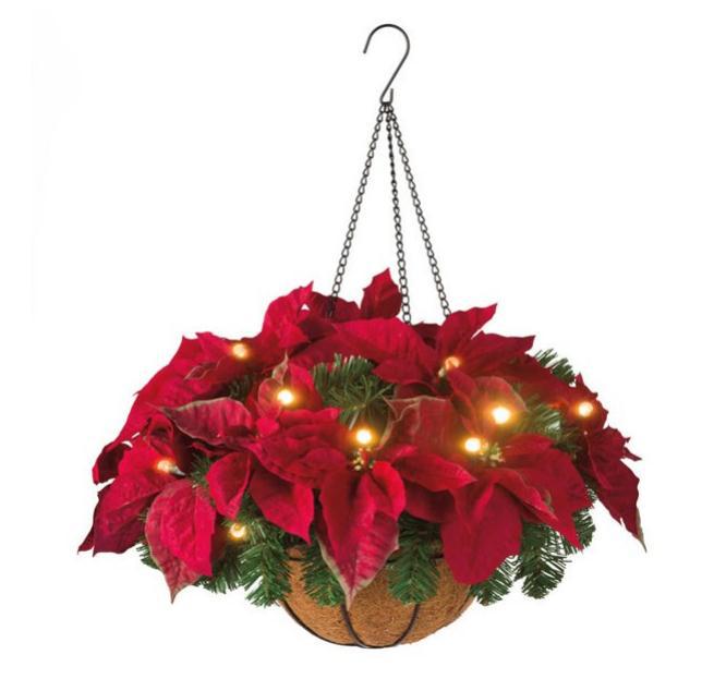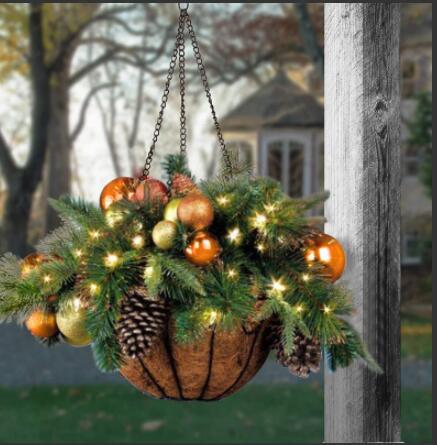 Pre-lit Artificial Christmas Hanging Basket, Mixed Decorations And White LED Lights